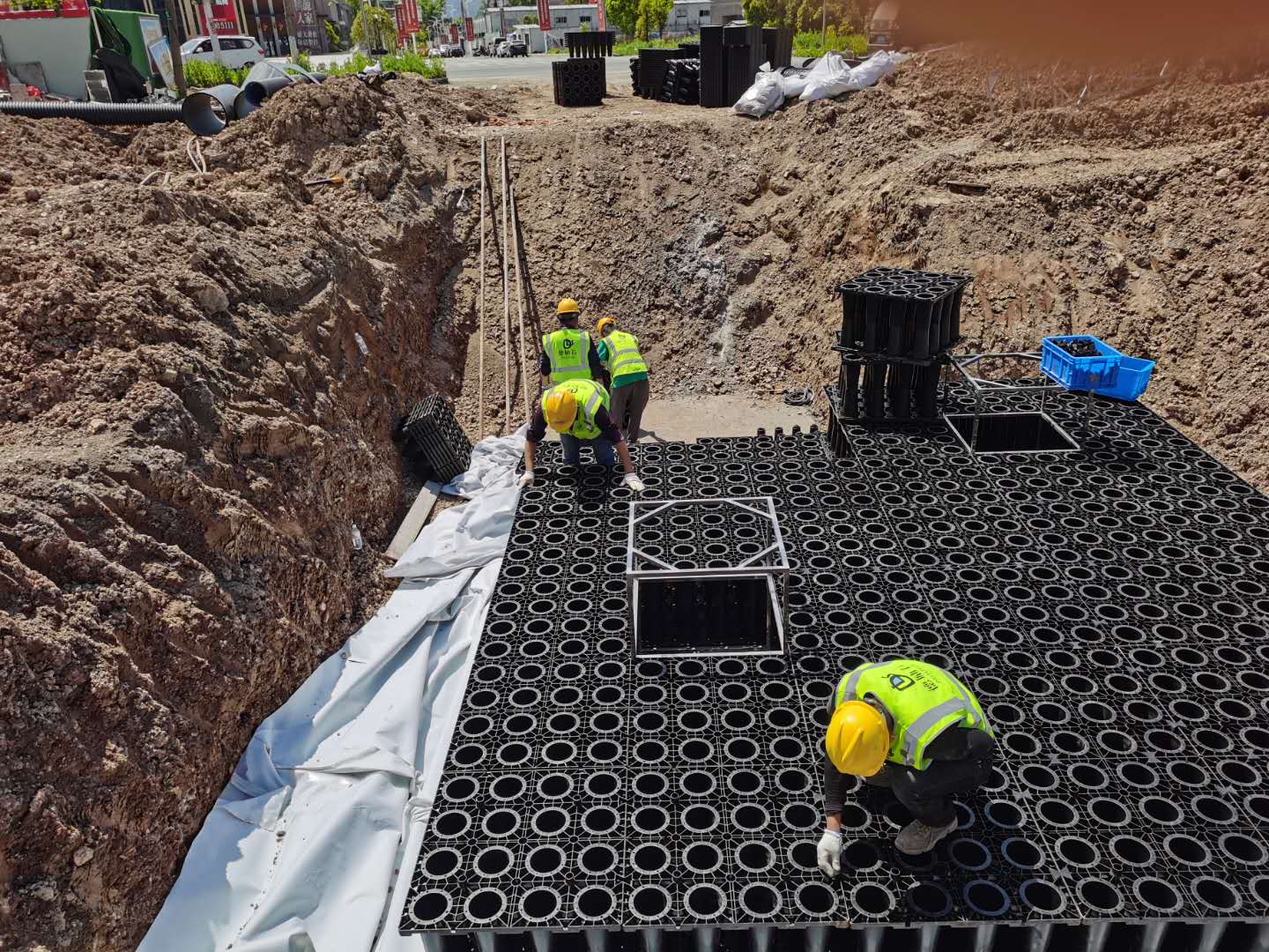 該項(xiàng)目雨水收集回用系統(tǒng)采用地埋PP模塊組合水池的方式收集雨水,前期經(jīng)過(guò)截污掛籃裝置、棄流過(guò)濾裝置,后期通過(guò)地埋一體機(jī)過(guò)濾,消毒,最終使水質(zhì)達(dá)到規(guī)范標(biāo)準(zhǔn),用于園區(qū)綠地的澆灑,景觀(guān)補(bǔ)水,道路沖洗等。