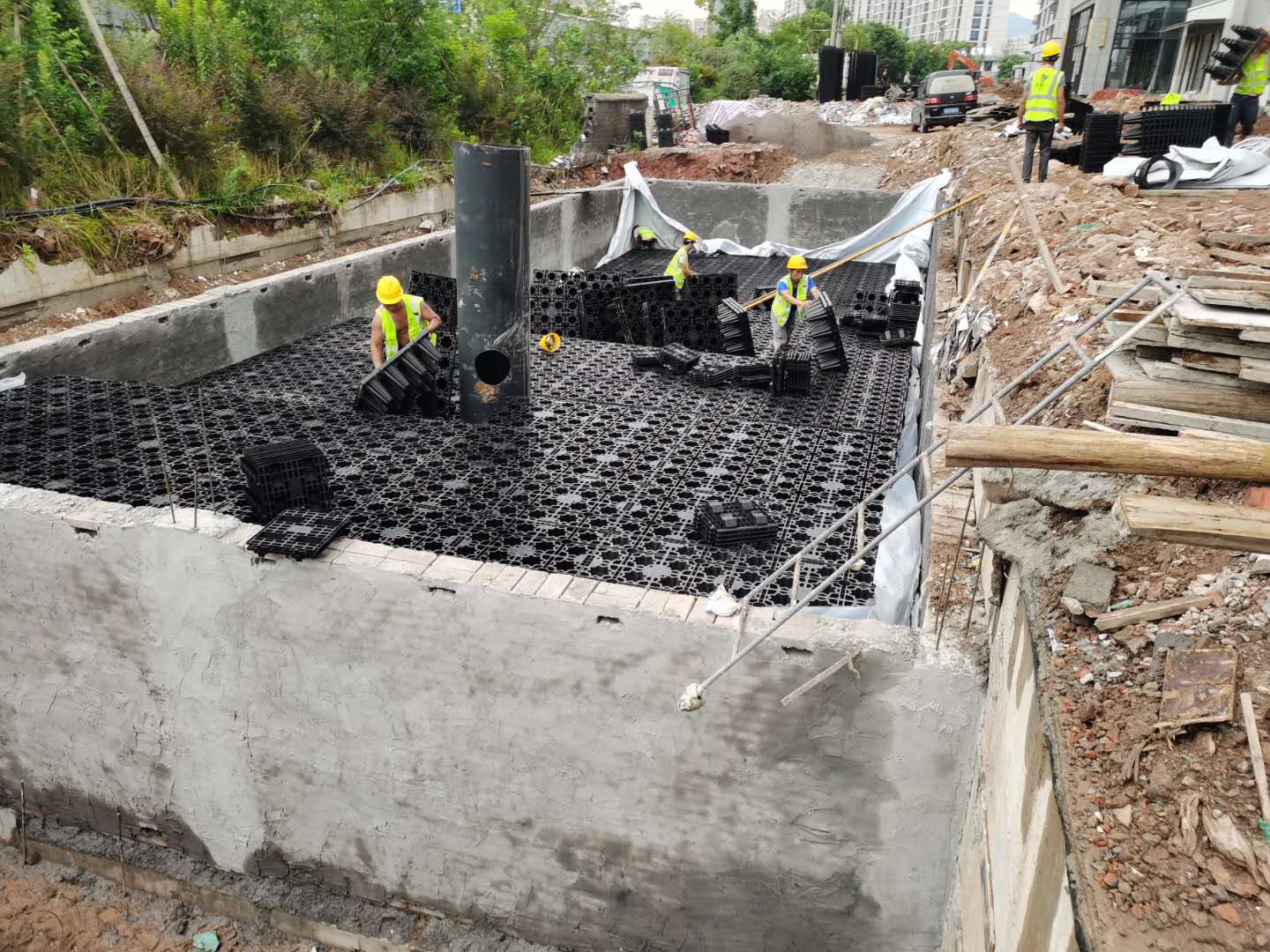 該項目雨水回收系統(tǒng)采用地埋PP模塊組合水池的方式收集雨水,前期經(jīng)過截污掛籃、棄流過濾,后期通過地埋一體機過濾,消毒,最終使水質(zhì)達到規(guī)范標準,用于廠區(qū)綠地的澆灑,景觀補水,道路沖洗。