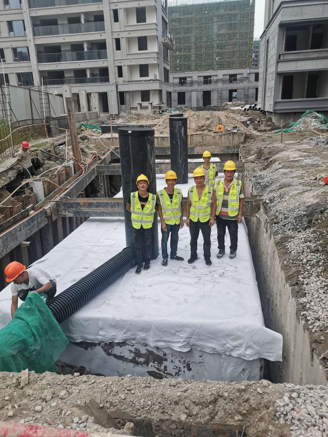 該項目雨水回收系統(tǒng)采用地埋PP模塊組合水池的方式收集雨水,前期經(jīng)過截污掛籃、棄流過濾,后期通過地埋一體機(jī)過濾,消毒,最終使水質(zhì)達(dá)到規(guī)范標(biāo)準(zhǔn),用于廠區(qū)綠地的澆灑,景觀補(bǔ)水,道路沖洗。