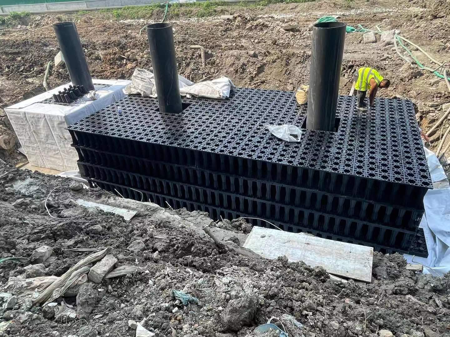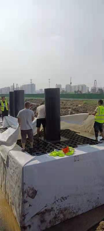 該項(xiàng)目雨水回收系統(tǒng)采用地埋PP模塊組合水池的方式收集雨水,前期經(jīng)過(guò)截污掛籃、棄流過(guò)濾,后期通過(guò)地埋一體機(jī)過(guò)濾,消毒,最終使水質(zhì)達(dá)到規(guī)范標(biāo)準(zhǔn),用于廠區(qū)綠地的澆灑,景觀補(bǔ)水,道路沖洗。